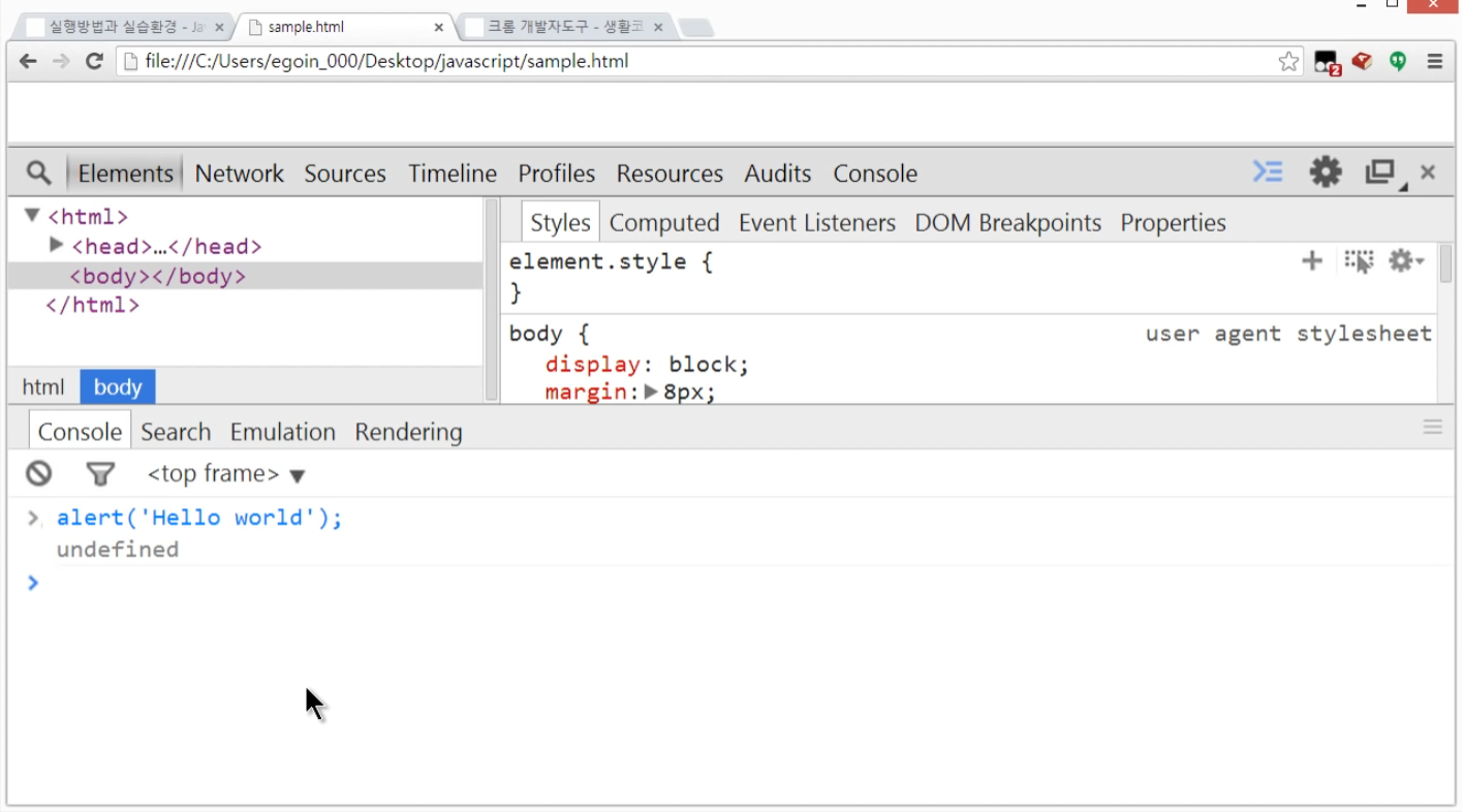 alert('Hello world')는 경고창에 Hello world라는 문구를 출력하라는 일종의 명령이다.